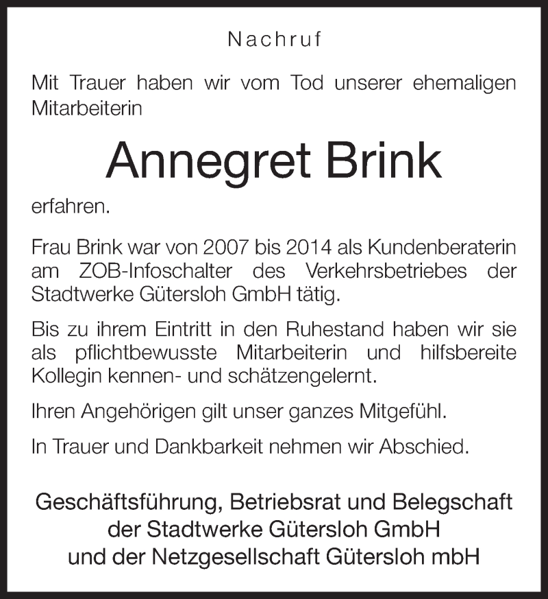 Hier finden Sie alle Traueranzeigen aus der Zeitung, die bisher für Annegret Brink erschienen sind. Weitere Traueranzeigen, die in der Zeitung erscheinen, werden hier ebenfalls aufgelistet