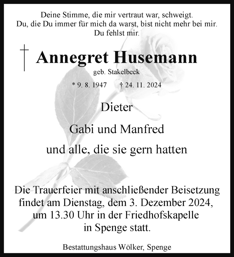 Hier finden Sie alle Traueranzeigen aus der Zeitung, die bisher für Annegret Husemann erschienen sind. Weitere Traueranzeigen, die in der Zeitung erscheinen, werden hier ebenfalls aufgelistet
