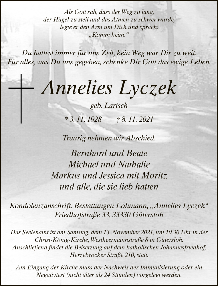 Hier finden Sie alle Traueranzeigen aus der Zeitung, die bisher für Annelies Lyczek erschienen sind. Weitere Traueranzeigen, die in der Zeitung erscheinen, werden hier ebenfalls aufgelistet