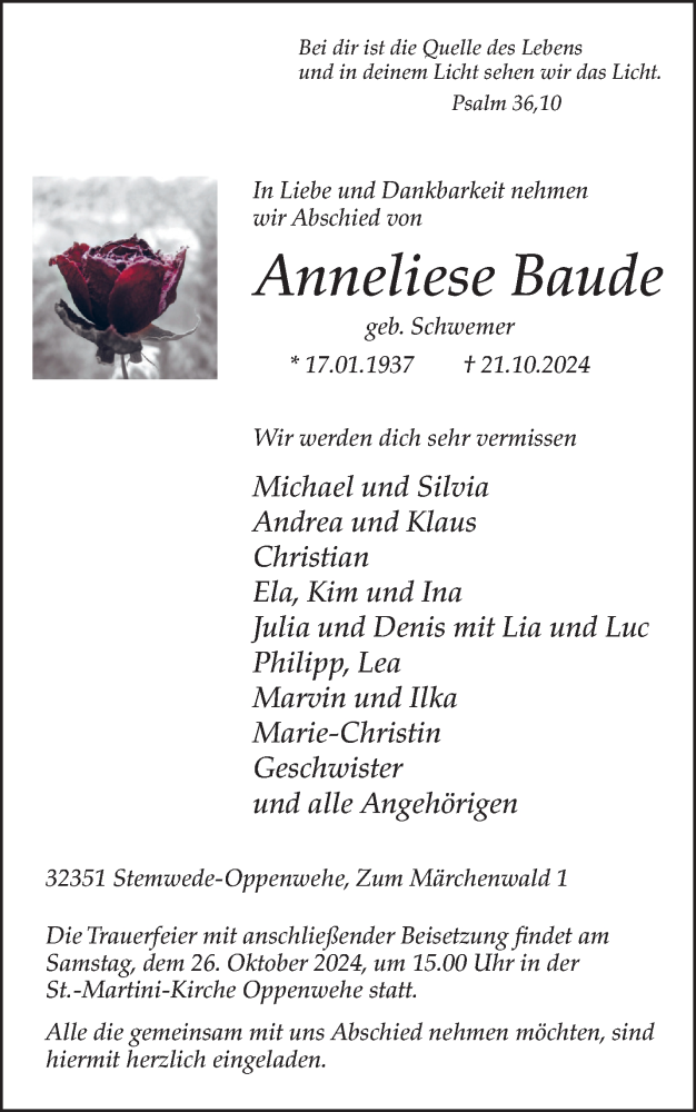Hier finden Sie alle Traueranzeigen aus der Zeitung, die bisher für Anneliese Baude erschienen sind. Weitere Traueranzeigen, die in der Zeitung erscheinen, werden hier ebenfalls aufgelistet