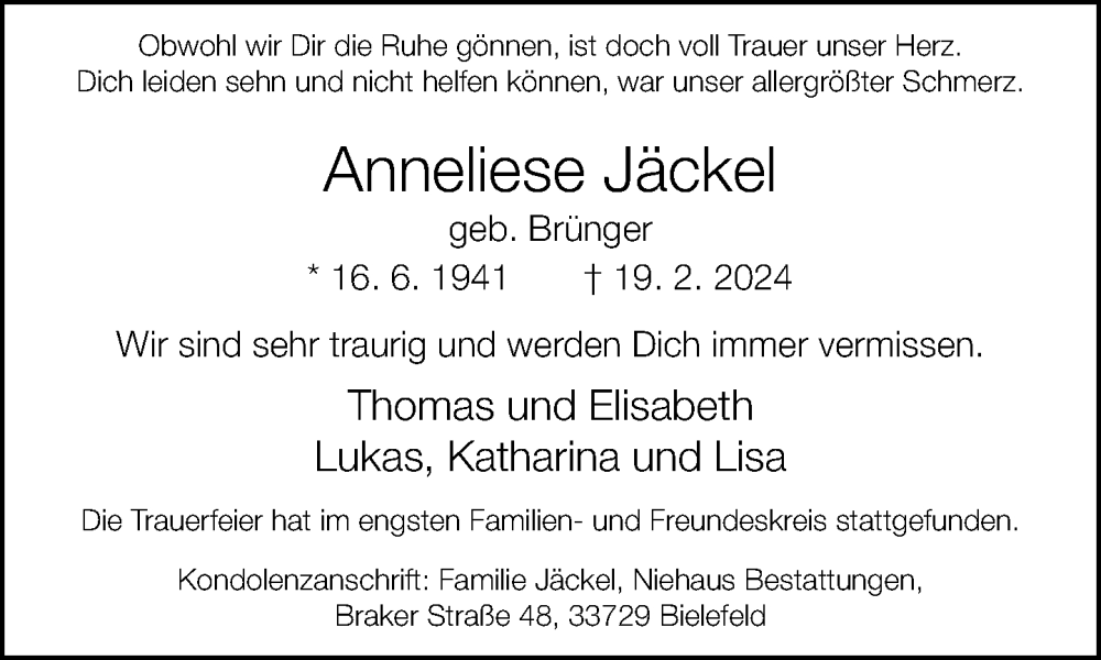 Hier finden Sie alle Traueranzeigen aus der Zeitung, die bisher für Anneliese Jäckel erschienen sind. Weitere Traueranzeigen, die in der Zeitung erscheinen, werden hier ebenfalls aufgelistet