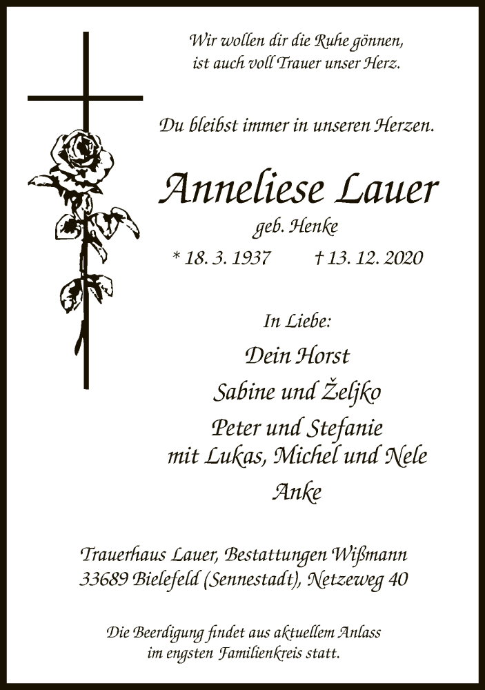 Hier finden Sie alle Traueranzeigen aus der Zeitung, die bisher für Anneliese Lauer erschienen sind. Weitere Traueranzeigen, die in der Zeitung erscheinen, werden hier ebenfalls aufgelistet