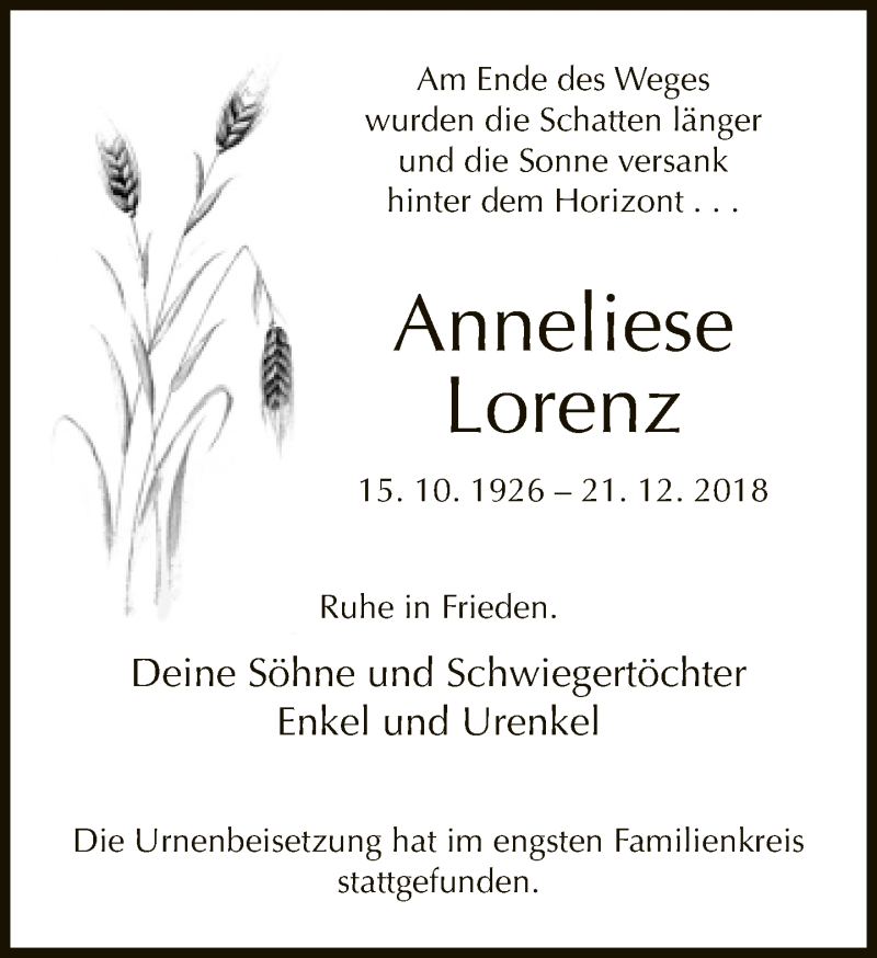 Hier finden Sie alle Traueranzeigen aus der Zeitung, die bisher für Anneliese Lorenz erschienen sind. Weitere Traueranzeigen, die in der Zeitung erscheinen, werden hier ebenfalls aufgelistet