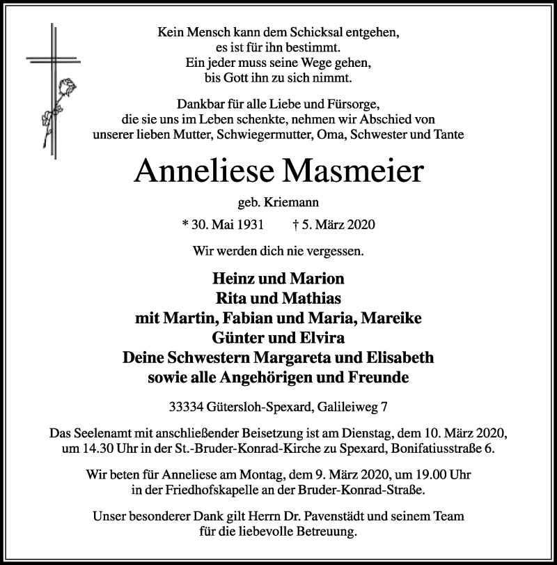 Hier finden Sie alle Traueranzeigen aus der Zeitung, die bisher für Anneliese Masmeier erschienen sind. Weitere Traueranzeigen, die in der Zeitung erscheinen, werden hier ebenfalls aufgelistet