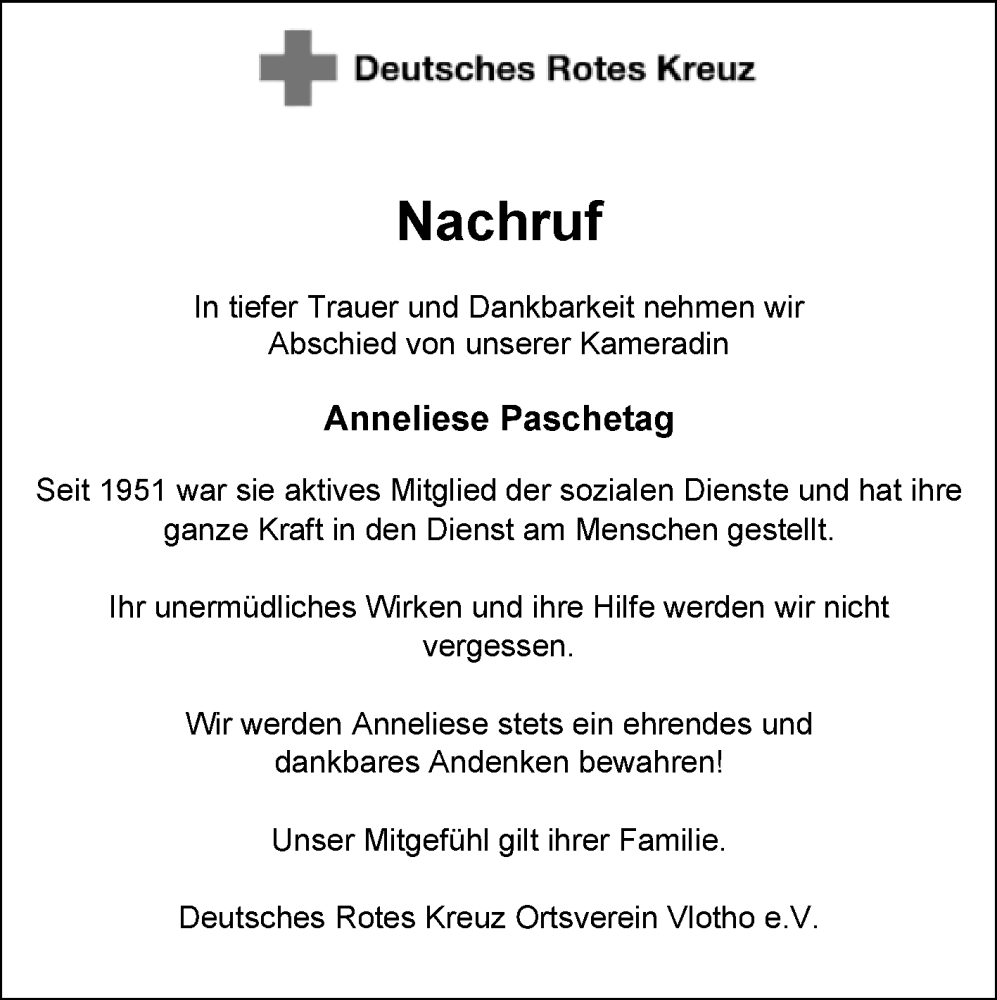 Hier finden Sie alle Traueranzeigen aus der Zeitung, die bisher für Anneliese Paschetag erschienen sind. Weitere Traueranzeigen, die in der Zeitung erscheinen, werden hier ebenfalls aufgelistet