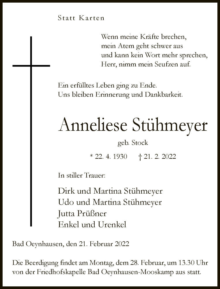 Hier finden Sie alle Traueranzeigen aus der Zeitung, die bisher für Anneliese Stühmeyer erschienen sind. Weitere Traueranzeigen, die in der Zeitung erscheinen, werden hier ebenfalls aufgelistet