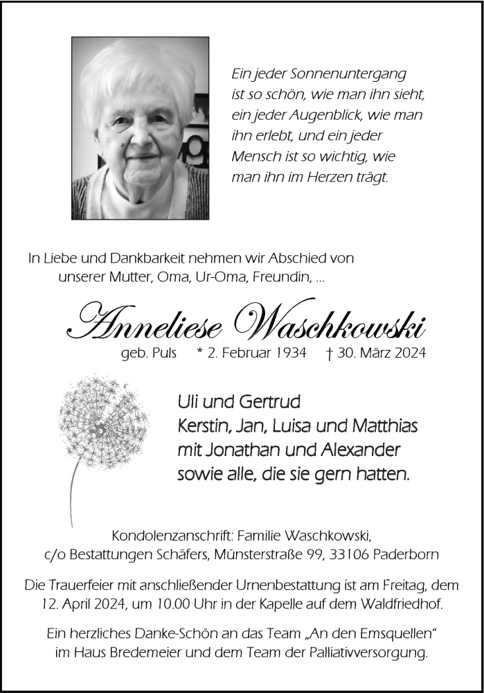 Hier finden Sie alle Traueranzeigen aus der Zeitung, die bisher für Anneliese Waschkowski erschienen sind. Weitere Traueranzeigen, die in der Zeitung erscheinen, werden hier ebenfalls aufgelistet