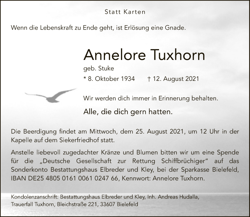 Hier finden Sie alle Traueranzeigen aus der Zeitung, die bisher für Annelore Tuxhorn erschienen sind. Weitere Traueranzeigen, die in der Zeitung erscheinen, werden hier ebenfalls aufgelistet