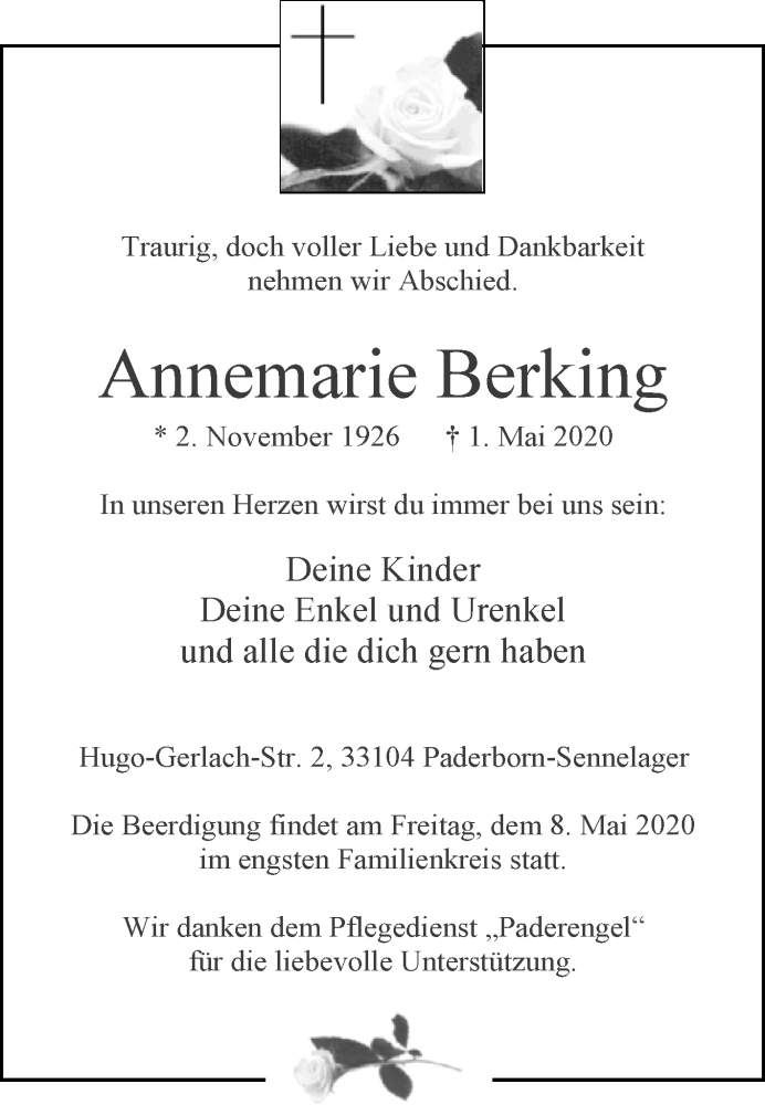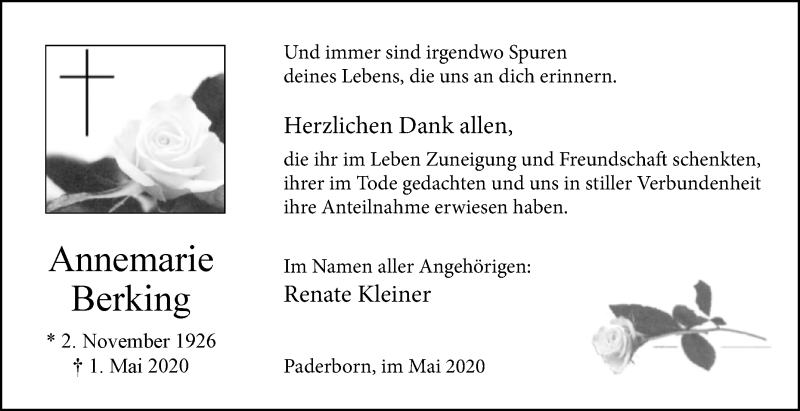 Hier finden Sie alle Traueranzeigen aus der Zeitung, die bisher für Annemarie Berking erschienen sind. Weitere Traueranzeigen, die in der Zeitung erscheinen, werden hier ebenfalls aufgelistet