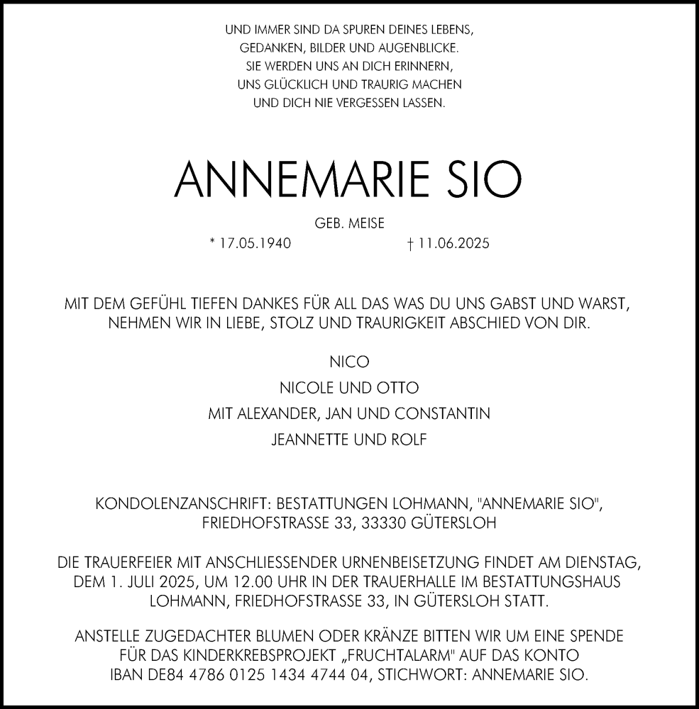 Hier finden Sie alle Traueranzeigen aus der Zeitung, die bisher für ANNEMARIE SIO erschienen sind. Weitere Traueranzeigen, die in der Zeitung erscheinen, werden hier ebenfalls aufgelistet