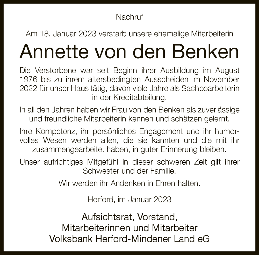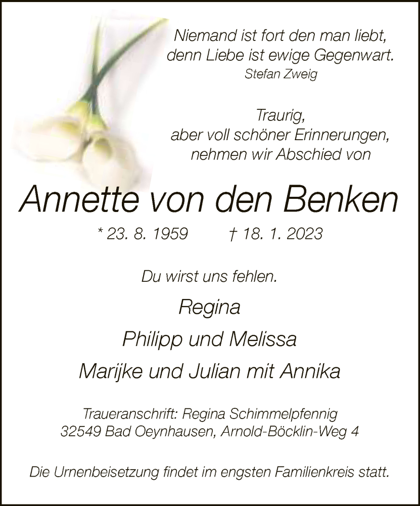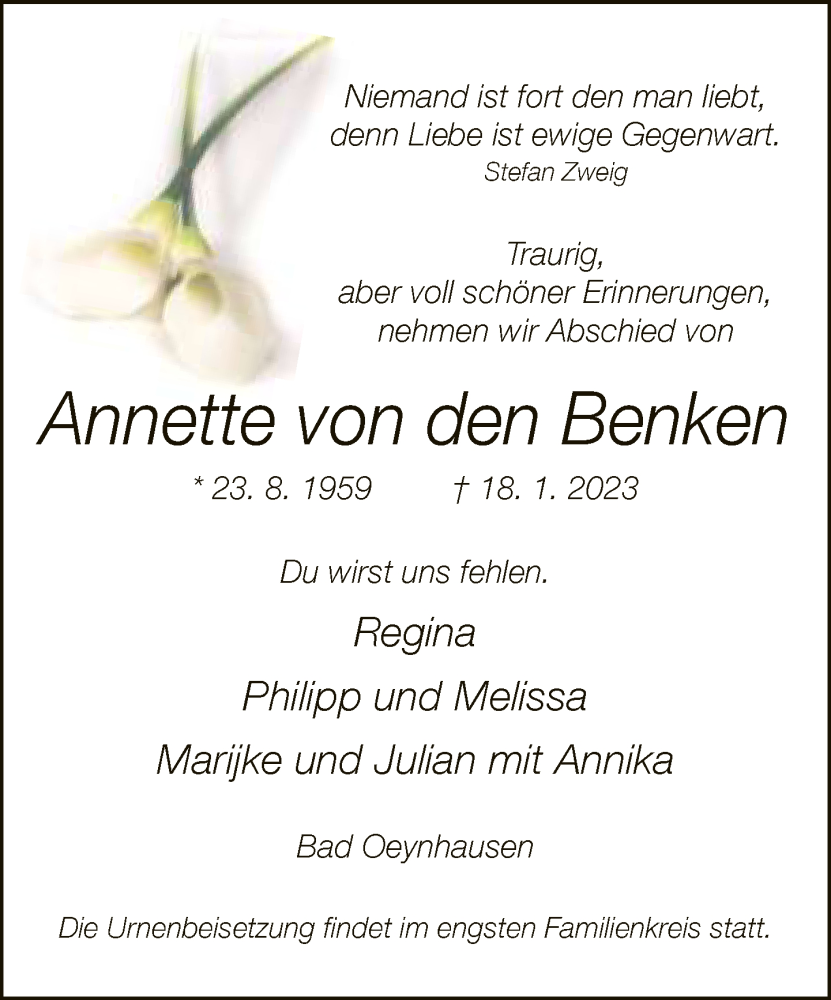 Hier finden Sie alle Traueranzeigen aus der Zeitung, die bisher für Annette von den Benken erschienen sind. Weitere Traueranzeigen, die in der Zeitung erscheinen, werden hier ebenfalls aufgelistet