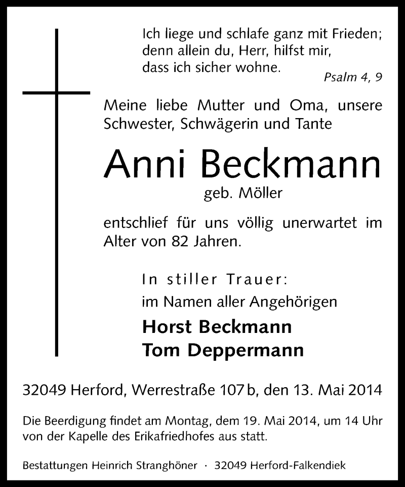 Hier finden Sie alle Traueranzeigen aus der Zeitung, die bisher für Anni Beckmann erschienen sind. Weitere Traueranzeigen, die in der Zeitung erscheinen, werden hier ebenfalls aufgelistet