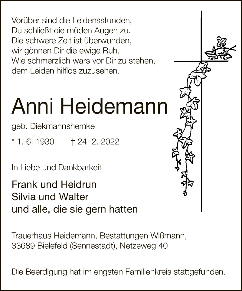 Hier finden Sie alle Traueranzeigen aus der Zeitung, die bisher für Anni Heidemann erschienen sind. Weitere Traueranzeigen, die in der Zeitung erscheinen, werden hier ebenfalls aufgelistet