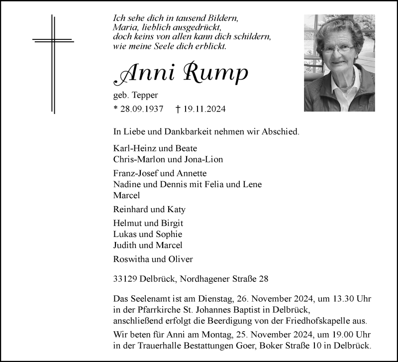 Hier finden Sie alle Traueranzeigen aus der Zeitung, die bisher für Anni Rump erschienen sind. Weitere Traueranzeigen, die in der Zeitung erscheinen, werden hier ebenfalls aufgelistet