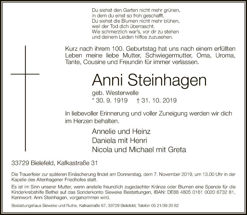 Hier finden Sie alle Traueranzeigen aus der Zeitung, die bisher für Anni Steinhagen erschienen sind. Weitere Traueranzeigen, die in der Zeitung erscheinen, werden hier ebenfalls aufgelistet