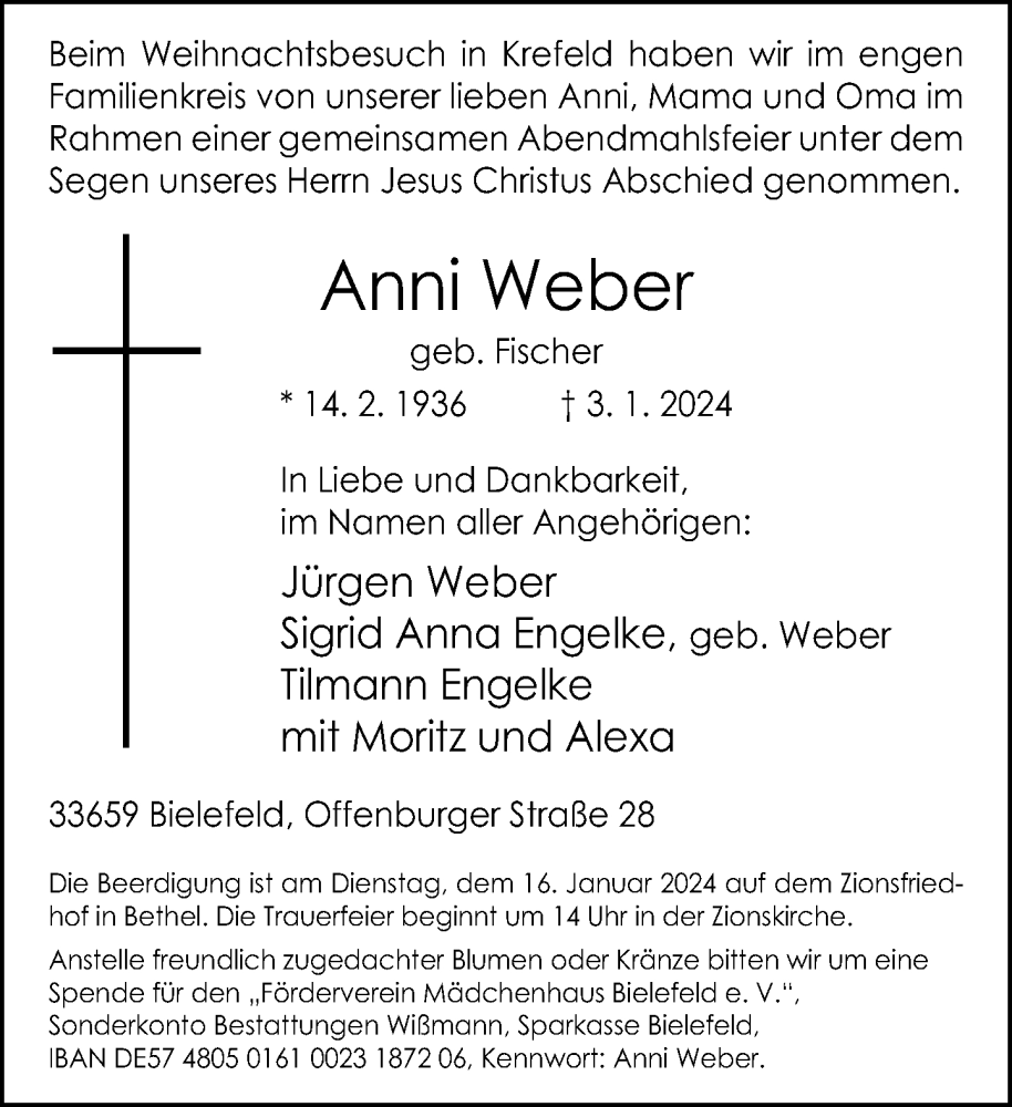 Hier finden Sie alle Traueranzeigen aus der Zeitung, die bisher für Anni Weber erschienen sind. Weitere Traueranzeigen, die in der Zeitung erscheinen, werden hier ebenfalls aufgelistet