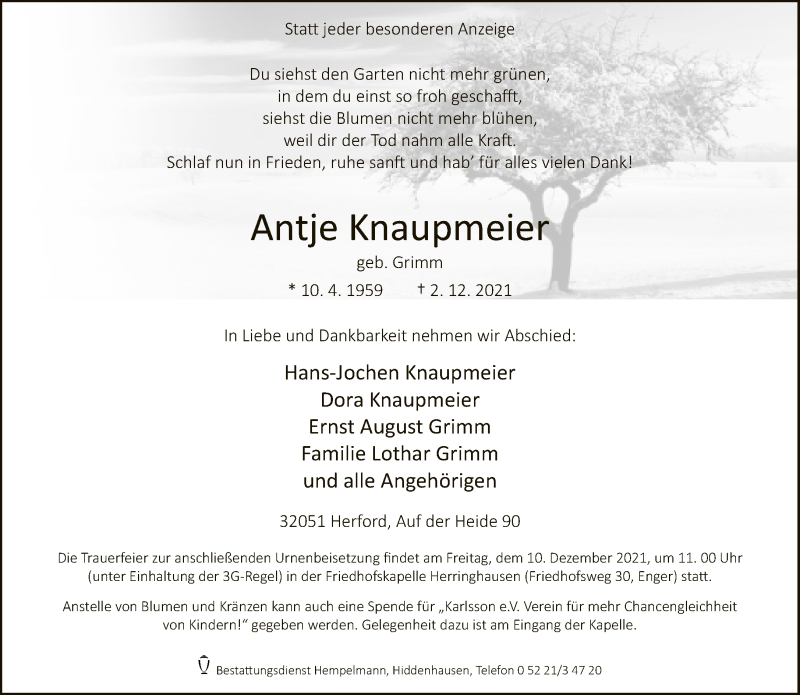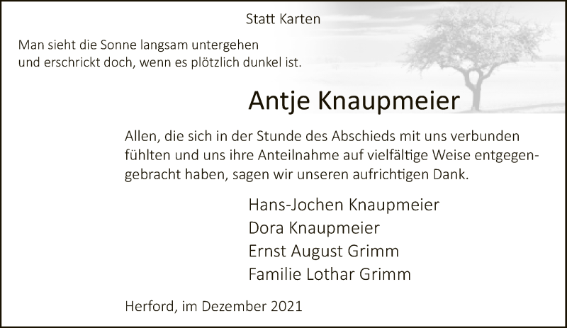 Hier finden Sie alle Traueranzeigen aus der Zeitung, die bisher für Antje Knaupmeier erschienen sind. Weitere Traueranzeigen, die in der Zeitung erscheinen, werden hier ebenfalls aufgelistet