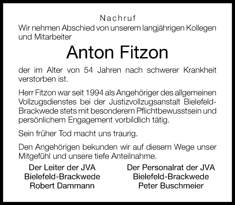 Hier finden Sie alle Traueranzeigen aus der Zeitung, die bisher für Anton Fitzon erschienen sind. Weitere Traueranzeigen, die in der Zeitung erscheinen, werden hier ebenfalls aufgelistet