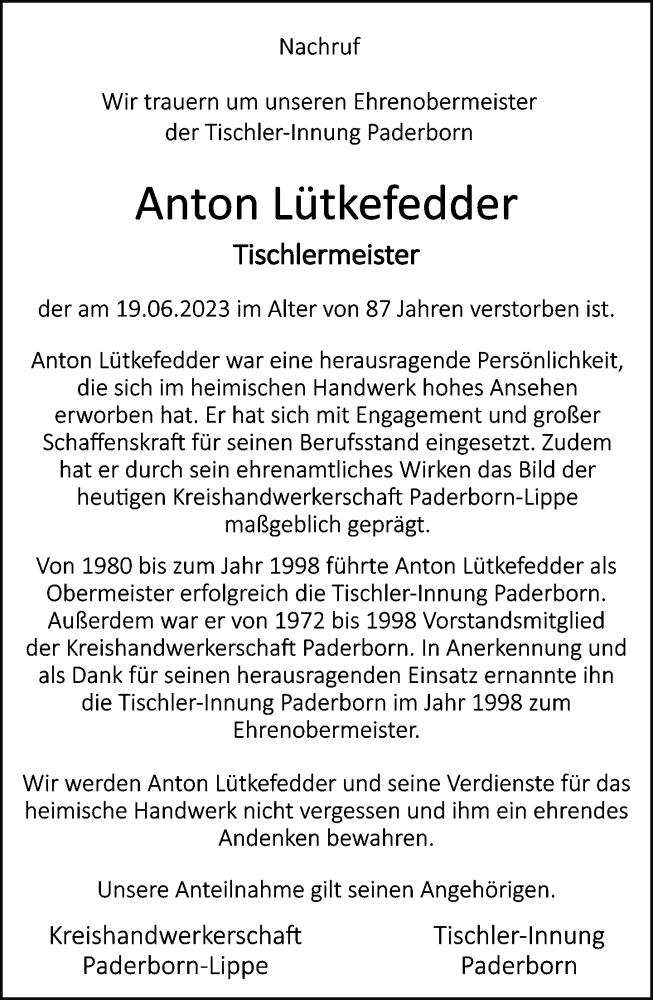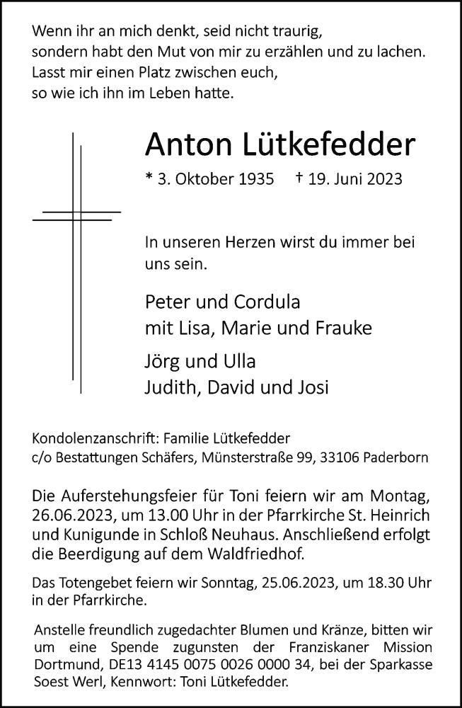 Hier finden Sie alle Traueranzeigen aus der Zeitung, die bisher für Anton Lütkefedder erschienen sind. Weitere Traueranzeigen, die in der Zeitung erscheinen, werden hier ebenfalls aufgelistet