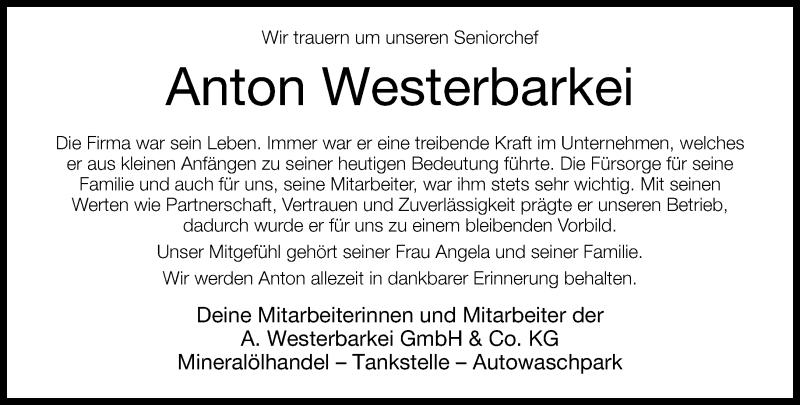 Hier finden Sie alle Traueranzeigen aus der Zeitung, die bisher für Anton Westerbarkei erschienen sind. Weitere Traueranzeigen, die in der Zeitung erscheinen, werden hier ebenfalls aufgelistet