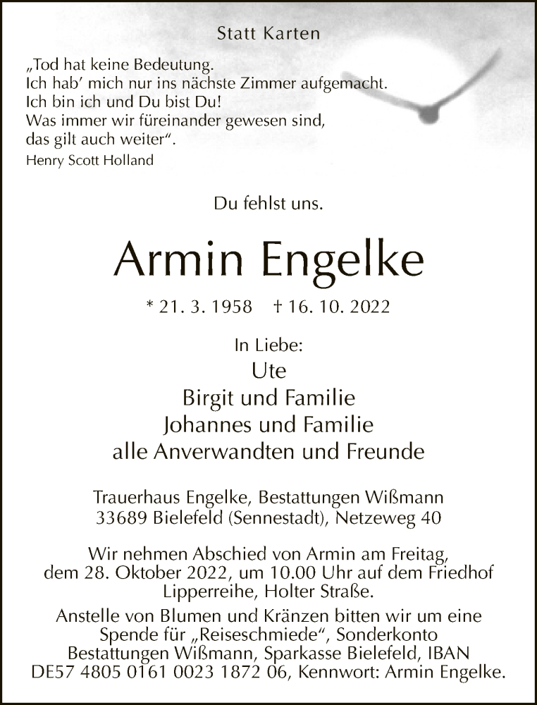 Hier finden Sie alle Traueranzeigen aus der Zeitung, die bisher für Armin Engelke erschienen sind. Weitere Traueranzeigen, die in der Zeitung erscheinen, werden hier ebenfalls aufgelistet