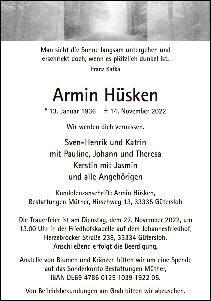 Hier finden Sie alle Traueranzeigen aus der Zeitung, die bisher für Armin Hüsken erschienen sind. Weitere Traueranzeigen, die in der Zeitung erscheinen, werden hier ebenfalls aufgelistet