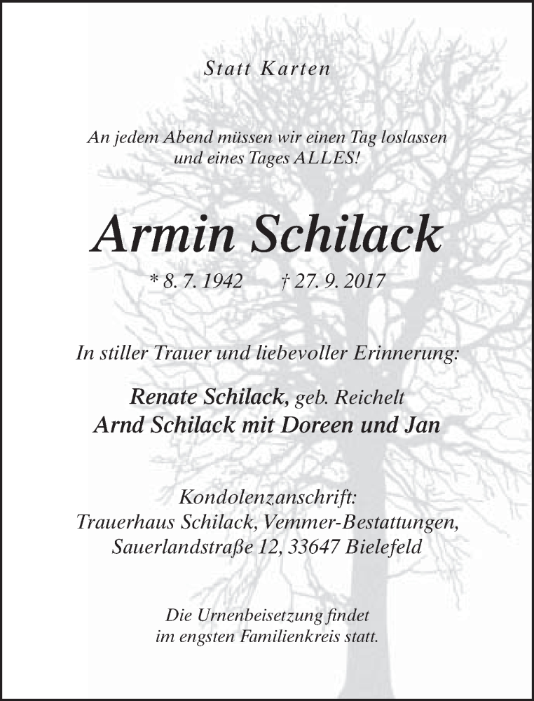 Hier finden Sie alle Traueranzeigen aus der Zeitung, die bisher für Armin Schilack erschienen sind. Weitere Traueranzeigen, die in der Zeitung erscheinen, werden hier ebenfalls aufgelistet