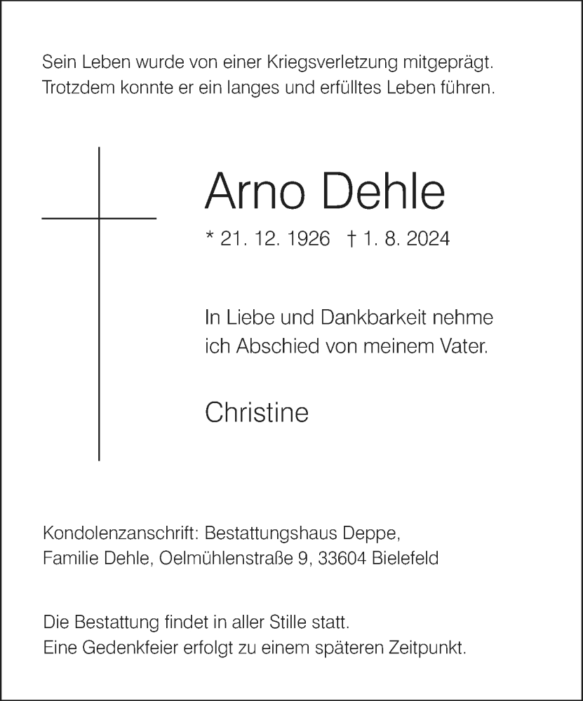 Hier finden Sie alle Traueranzeigen aus der Zeitung, die bisher für Arno Dehle erschienen sind. Weitere Traueranzeigen, die in der Zeitung erscheinen, werden hier ebenfalls aufgelistet