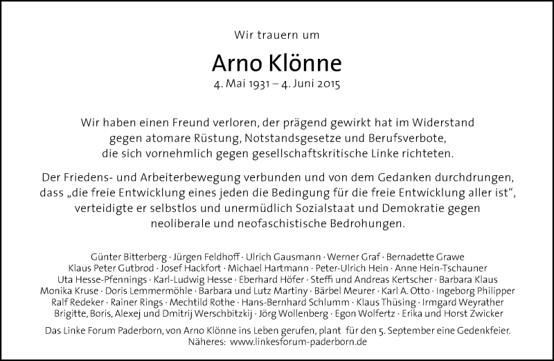 Hier finden Sie alle Traueranzeigen aus der Zeitung, die bisher für Arno Klönne erschienen sind. Weitere Traueranzeigen, die in der Zeitung erscheinen, werden hier ebenfalls aufgelistet