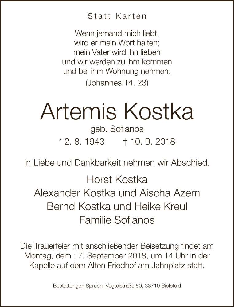 Hier finden Sie alle Traueranzeigen aus der Zeitung, die bisher für Artemis Kostka erschienen sind. Weitere Traueranzeigen, die in der Zeitung erscheinen, werden hier ebenfalls aufgelistet