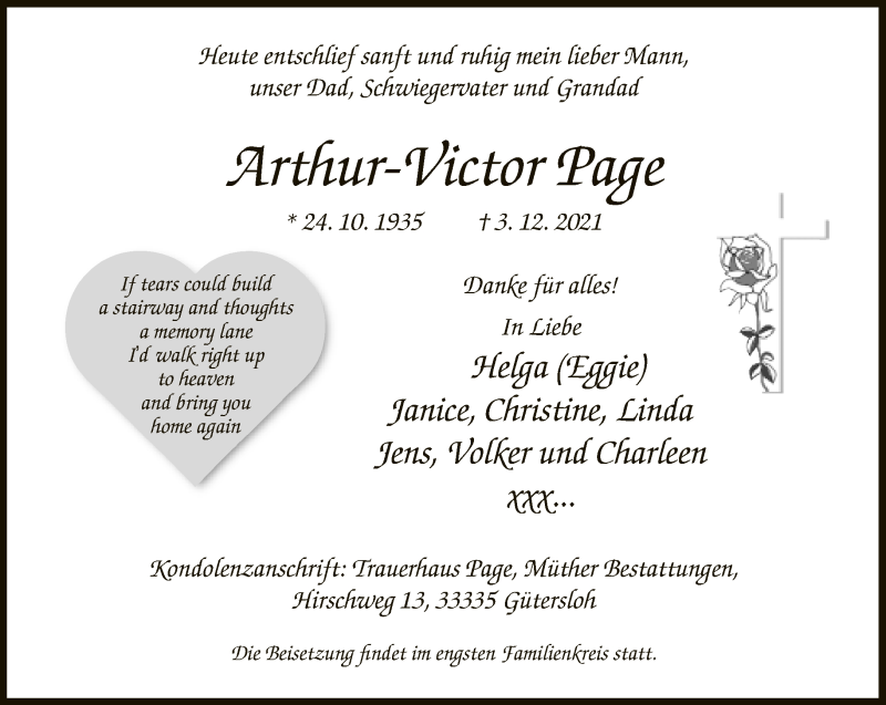Hier finden Sie alle Traueranzeigen aus der Zeitung, die bisher für Arthur-Victor Page erschienen sind. Weitere Traueranzeigen, die in der Zeitung erscheinen, werden hier ebenfalls aufgelistet