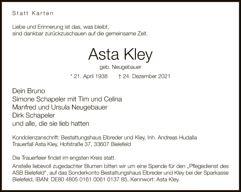 Hier finden Sie alle Traueranzeigen aus der Zeitung, die bisher für Asta Kley erschienen sind. Weitere Traueranzeigen, die in der Zeitung erscheinen, werden hier ebenfalls aufgelistet