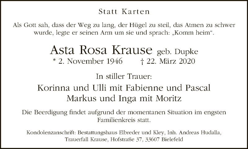 Hier finden Sie alle Traueranzeigen aus der Zeitung, die bisher für Asta Rosa Krause erschienen sind. Weitere Traueranzeigen, die in der Zeitung erscheinen, werden hier ebenfalls aufgelistet