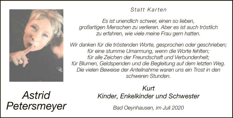 Hier finden Sie alle Traueranzeigen aus der Zeitung, die bisher für Astrid Petersmeyer erschienen sind. Weitere Traueranzeigen, die in der Zeitung erscheinen, werden hier ebenfalls aufgelistet