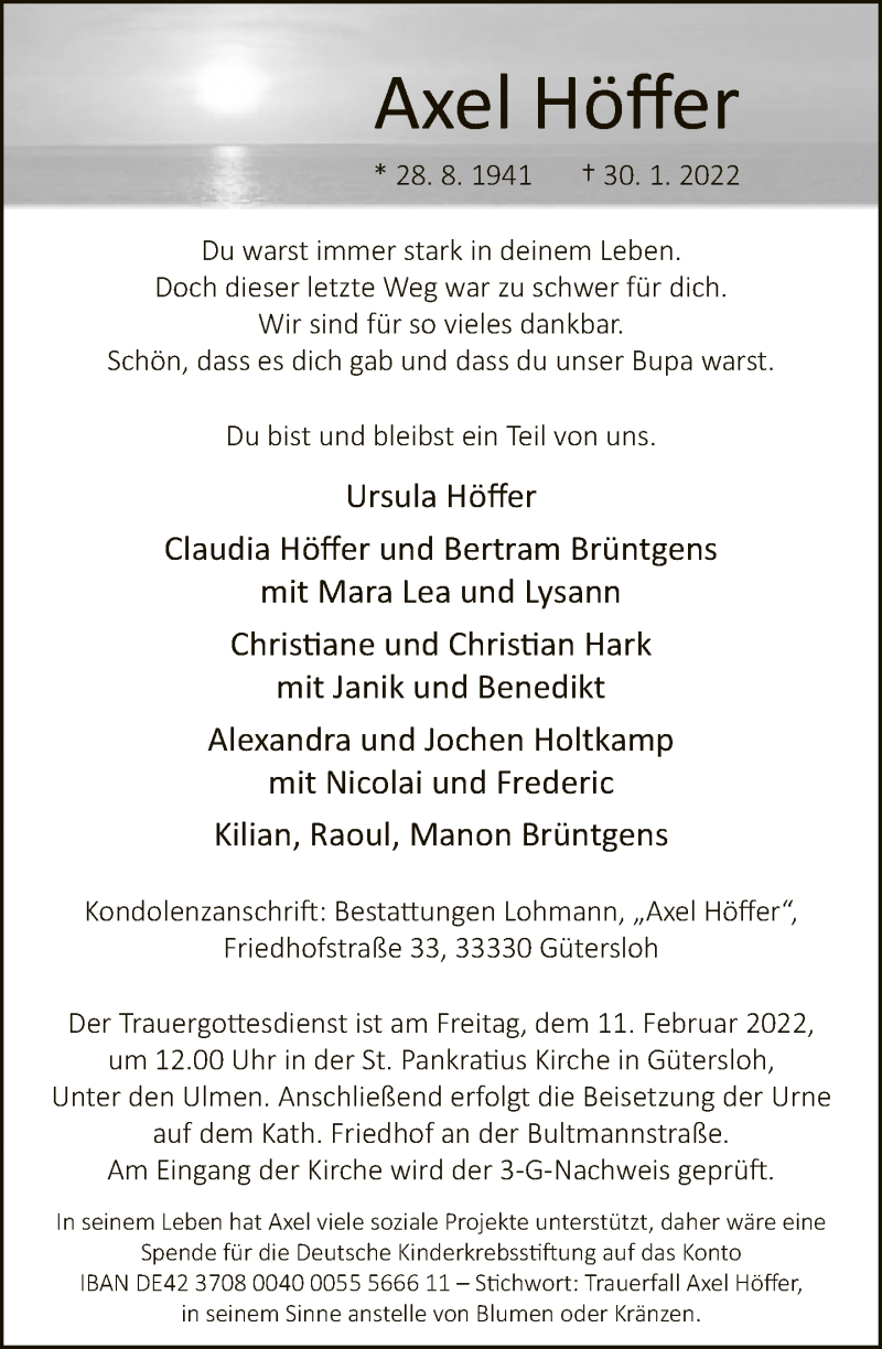 Hier finden Sie alle Traueranzeigen aus der Zeitung, die bisher für Axel Höffer erschienen sind. Weitere Traueranzeigen, die in der Zeitung erscheinen, werden hier ebenfalls aufgelistet