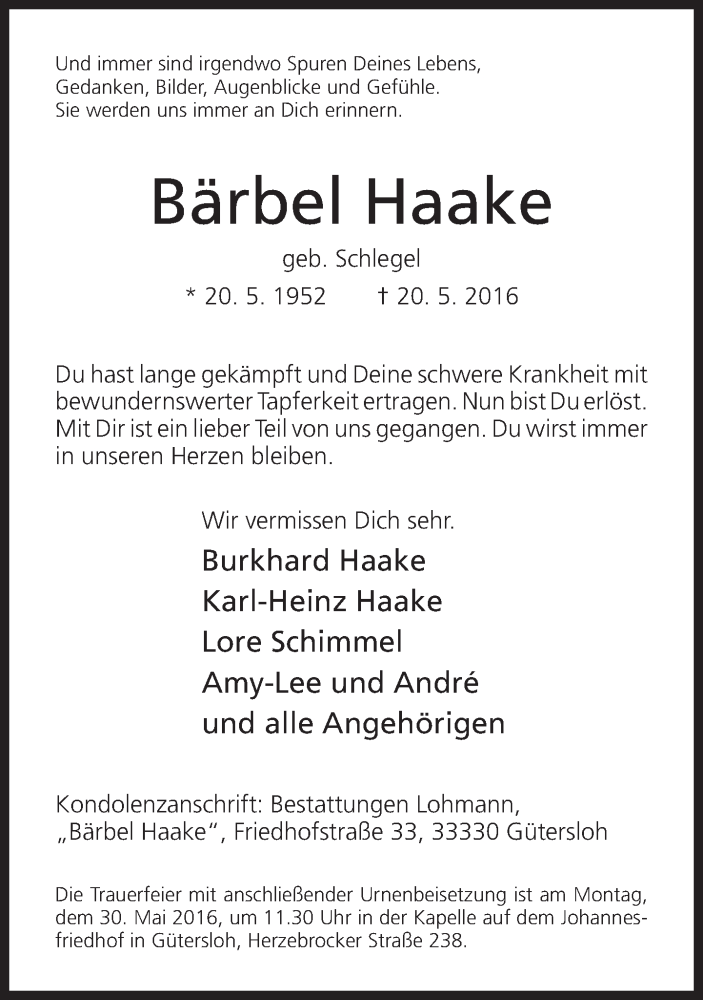 Hier finden Sie alle Traueranzeigen aus der Zeitung, die bisher für Bärbel Haake erschienen sind. Weitere Traueranzeigen, die in der Zeitung erscheinen, werden hier ebenfalls aufgelistet
