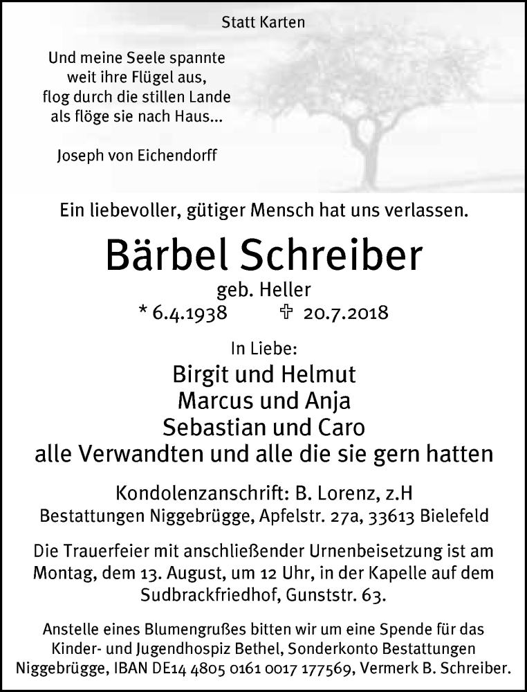 Hier finden Sie alle Traueranzeigen aus der Zeitung, die bisher für Bärbel Schreiber erschienen sind. Weitere Traueranzeigen, die in der Zeitung erscheinen, werden hier ebenfalls aufgelistet