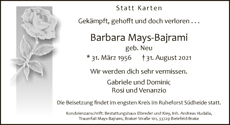 Hier finden Sie alle Traueranzeigen aus der Zeitung, die bisher für Barbara Mays-Bajrami erschienen sind. Weitere Traueranzeigen, die in der Zeitung erscheinen, werden hier ebenfalls aufgelistet