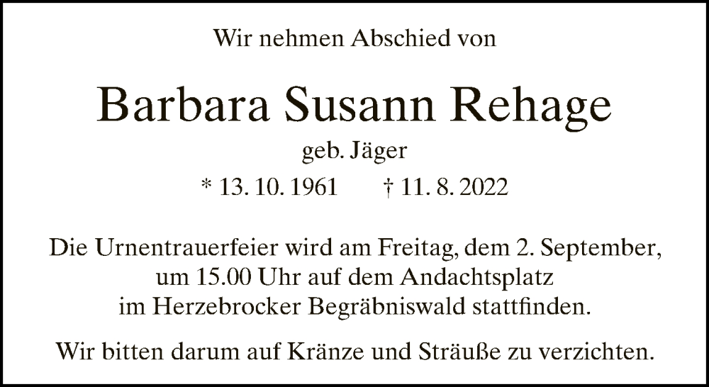 Hier finden Sie alle Traueranzeigen aus der Zeitung, die bisher für Barbara Susann Rehage erschienen sind. Weitere Traueranzeigen, die in der Zeitung erscheinen, werden hier ebenfalls aufgelistet
