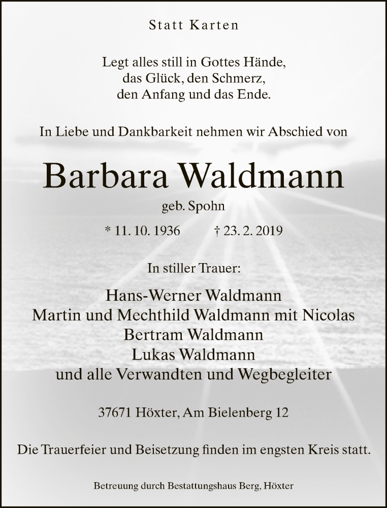 Hier finden Sie alle Traueranzeigen aus der Zeitung, die bisher für Barbara Waldmann erschienen sind. Weitere Traueranzeigen, die in der Zeitung erscheinen, werden hier ebenfalls aufgelistet