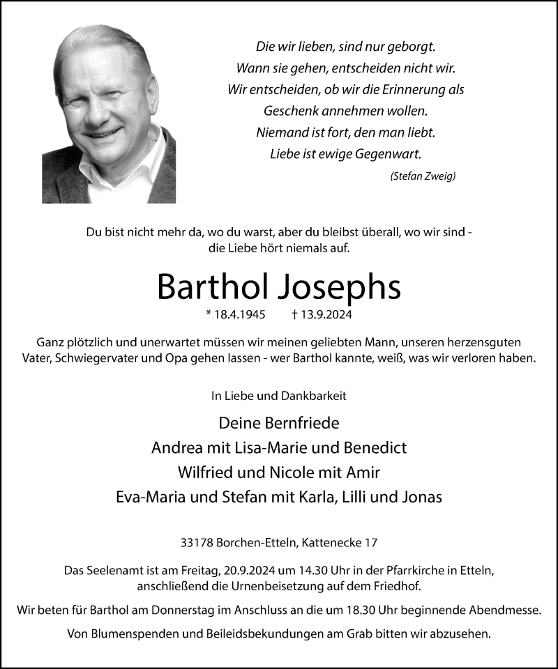 Hier finden Sie alle Traueranzeigen aus der Zeitung, die bisher für Barthol Josephs erschienen sind. Weitere Traueranzeigen, die in der Zeitung erscheinen, werden hier ebenfalls aufgelistet
