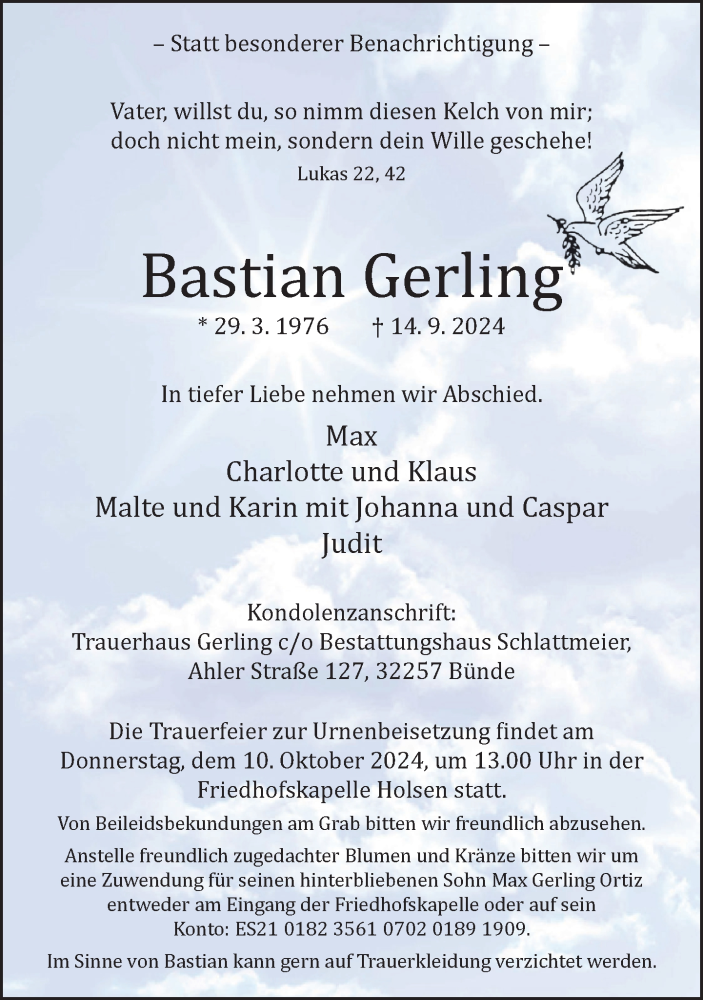 Hier finden Sie alle Traueranzeigen aus der Zeitung, die bisher für Bastian Gerling erschienen sind. Weitere Traueranzeigen, die in der Zeitung erscheinen, werden hier ebenfalls aufgelistet