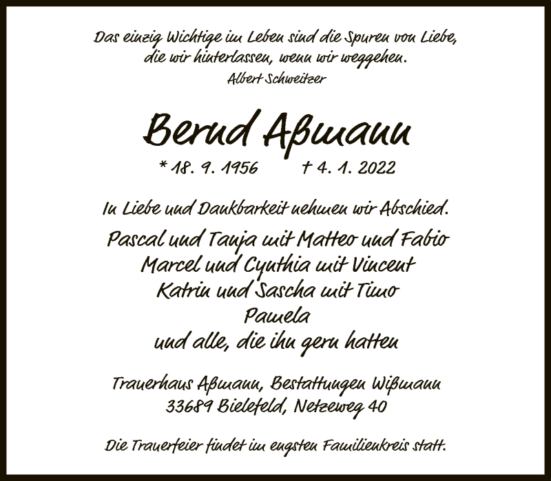 Hier finden Sie alle Traueranzeigen aus der Zeitung, die bisher für Bernd Aßmann erschienen sind. Weitere Traueranzeigen, die in der Zeitung erscheinen, werden hier ebenfalls aufgelistet