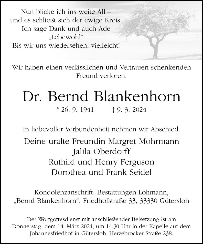 Hier finden Sie alle Traueranzeigen aus der Zeitung, die bisher für Bernd Blankenhorn erschienen sind. Weitere Traueranzeigen, die in der Zeitung erscheinen, werden hier ebenfalls aufgelistet