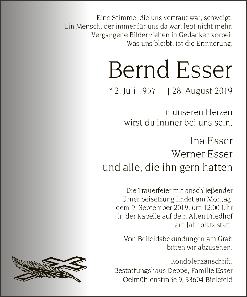 Hier finden Sie alle Traueranzeigen aus der Zeitung, die bisher für Bernd Esser erschienen sind. Weitere Traueranzeigen, die in der Zeitung erscheinen, werden hier ebenfalls aufgelistet