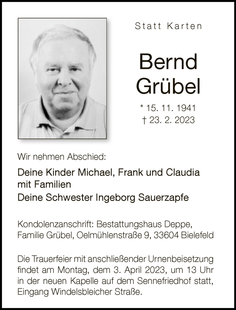 Hier finden Sie alle Traueranzeigen aus der Zeitung, die bisher für Bernd Grübel erschienen sind. Weitere Traueranzeigen, die in der Zeitung erscheinen, werden hier ebenfalls aufgelistet
