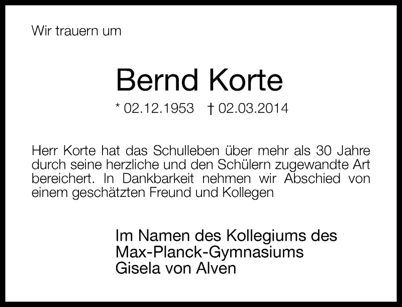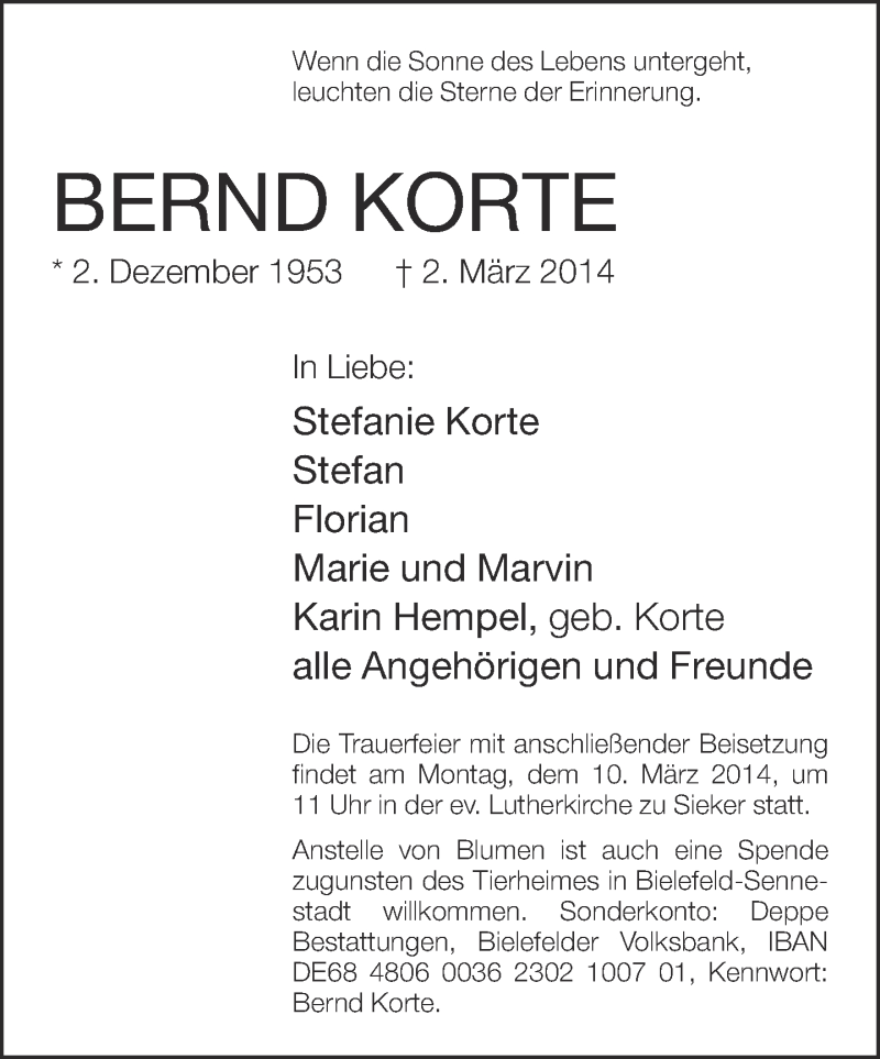 Hier finden Sie alle Traueranzeigen aus der Zeitung, die bisher für Bernd Korte erschienen sind. Weitere Traueranzeigen, die in der Zeitung erscheinen, werden hier ebenfalls aufgelistet