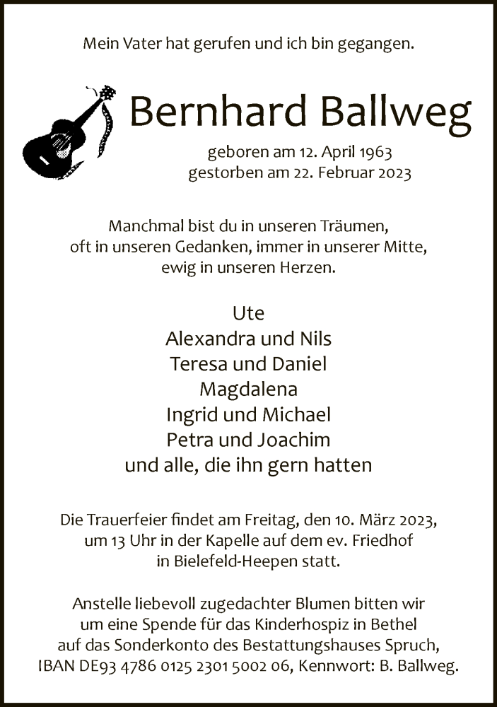 Hier finden Sie alle Traueranzeigen aus der Zeitung, die bisher für Bernhard Ballweg erschienen sind. Weitere Traueranzeigen, die in der Zeitung erscheinen, werden hier ebenfalls aufgelistet