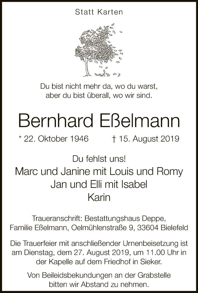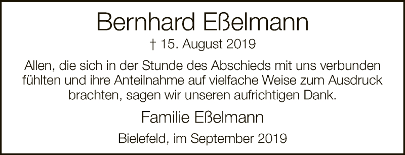 Hier finden Sie alle Traueranzeigen aus der Zeitung, die bisher für Bernhard Eßelmann erschienen sind. Weitere Traueranzeigen, die in der Zeitung erscheinen, werden hier ebenfalls aufgelistet