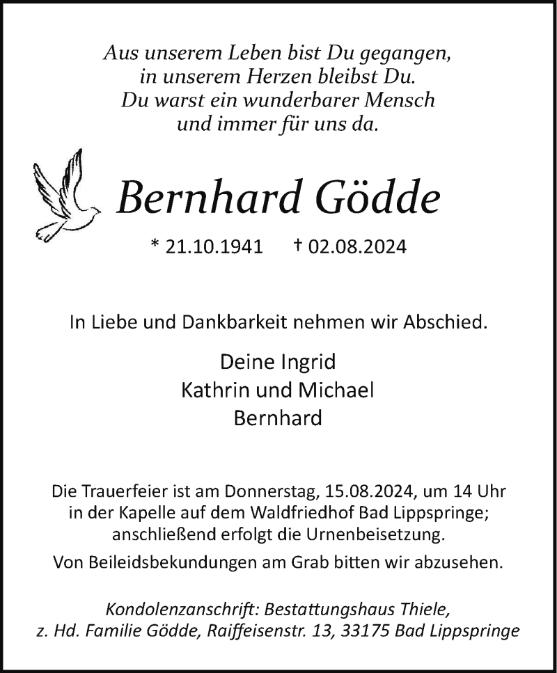 Hier finden Sie alle Traueranzeigen aus der Zeitung, die bisher für Bernhard Gödde erschienen sind. Weitere Traueranzeigen, die in der Zeitung erscheinen, werden hier ebenfalls aufgelistet